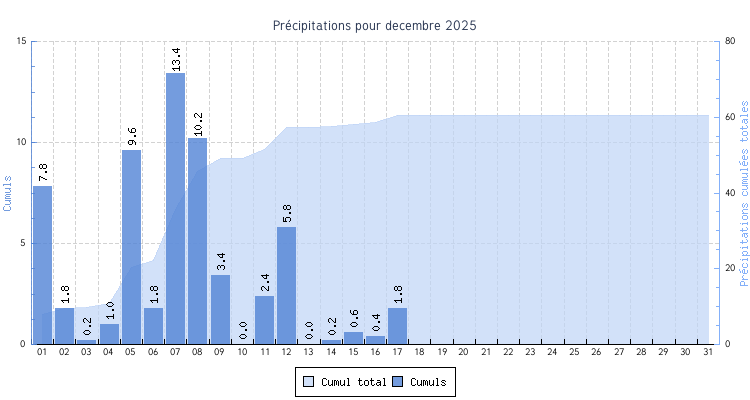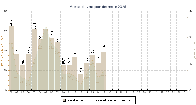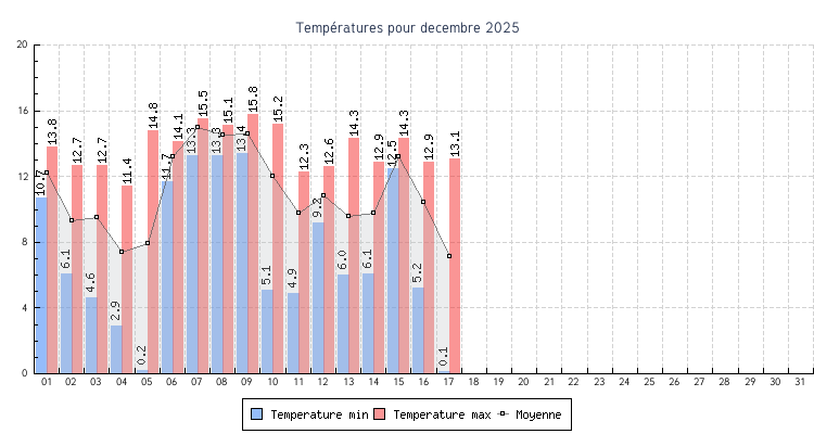 | 17 | 0.1 °C à 08:02 | 13.1 °C à 21:55 | 7.1 °C | 7.4 km/h (38.6 km/h) | 221 |
